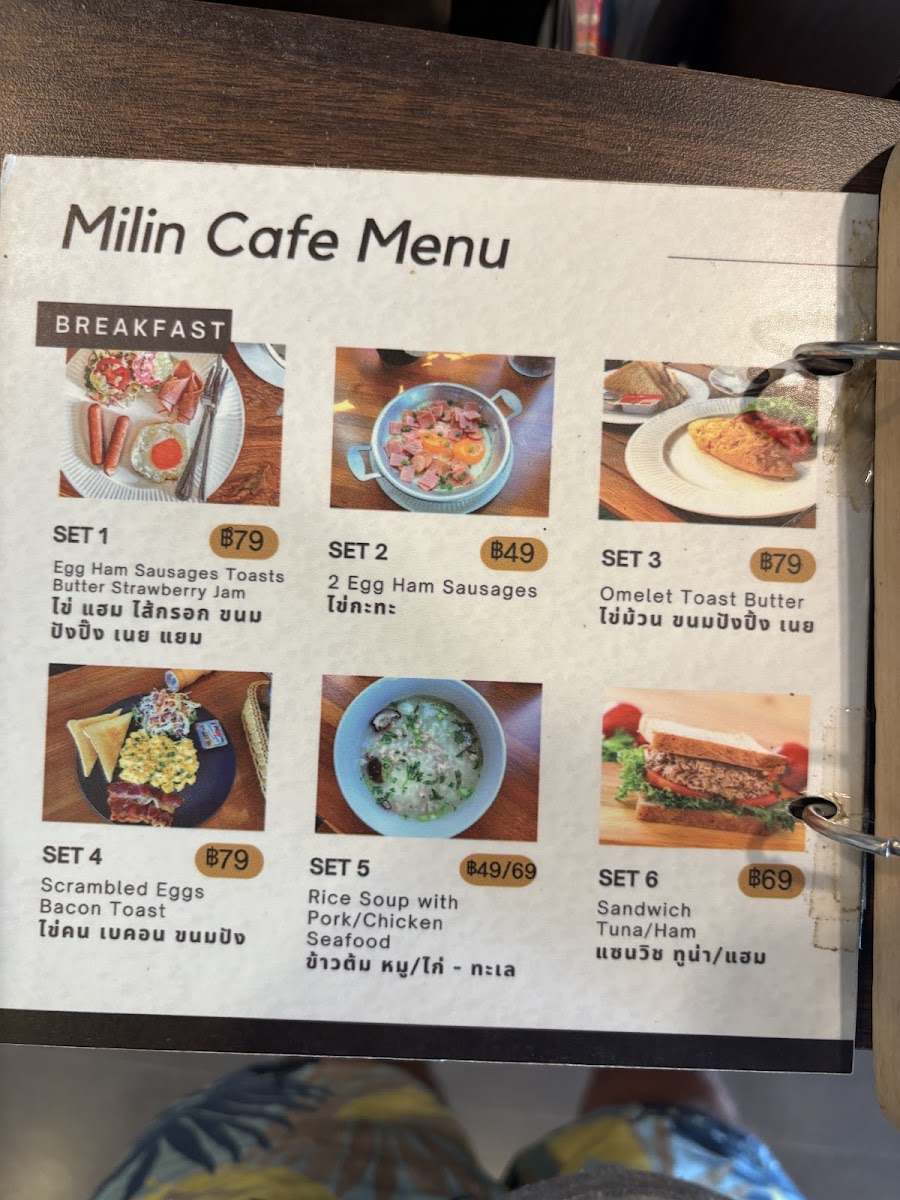 Milin Cafe specializes in a variety of delicious options that will tantalize your taste buds. Start your day with their satisfying Omelet with Toast (THB 109), a hearty breakfast that provides the perfect fuel for your adventures. If you're in the mood for something lighter, the Rice Soup with Pork (THB 59) is a comforting classic that warms the soul. Be sure to pair your meal with a drink; the Hot Espresso (THB 35) is rich and robust, while a creamy Iced Cappuccino (THB 50) promises to cool you down on warm afternoons.